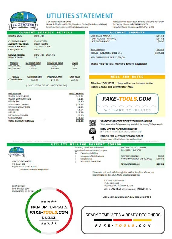 USA Florida City of Edgewater utility bill Word and Pdf Template use for :