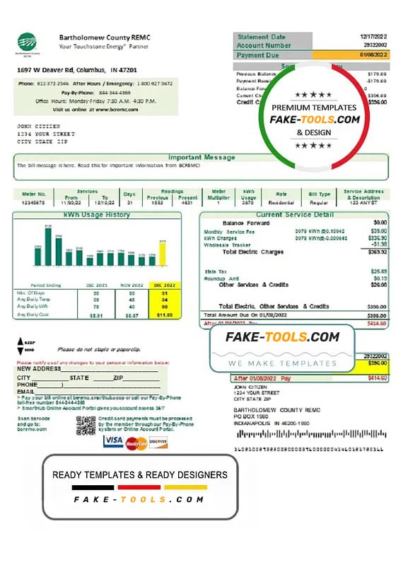 Grab now fully editable USA Indiana Bartholomew County REMC utility bill Word Template from our website fake tools and put your own info to create a fake copy of Fake USA Indiana Bartholomew County REMC utility bill Word template and ready your own novelty documents. It’ll be so beneficial if your utility bill is expired, stolen or not available. We also have printable passport psd template, ID Card psd template, Bank Statement psd template, fake driver license front and back & Utility bill psd template.