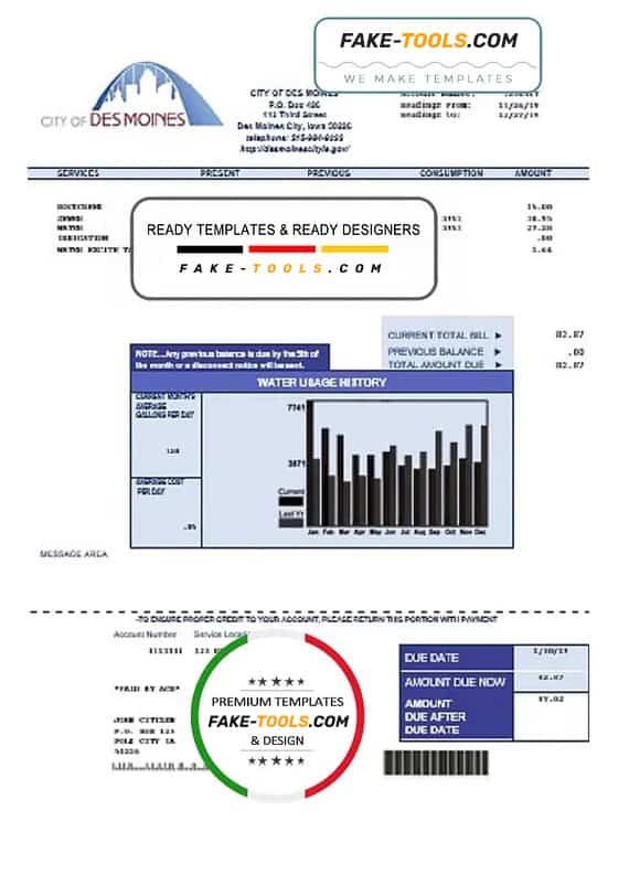 Grab now fully editable USA Iowa City of Des Moines water utility bill Word Template from our website fake tools and put your own info to create a fake copy of Fake USA Iowa City of Des Moines water utility bill Word template and ready your own novelty documents. It’ll be so beneficial if your utility bill is expired, stolen or not available. We also have printable passport psd template, ID Card psd template, Bank Statement psd template, fake driver license front and back & Utility bill psd template.