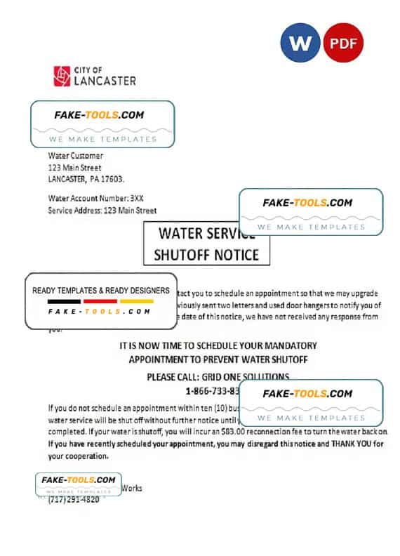 USA Lancaster Water service utility bill Word and Pdf Template use for :