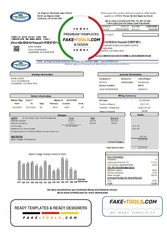 Grab now fully editable USA Las Virgenes Municipal Water District utility bill Word Template from our website fake tools and put your own info to create a fake copy of Fake USA Las Virgenes Municipal Water District utility bill Word template and ready your own novelty documents. It’ll be so beneficial if your utility bill is expired, stolen or not available. We also have printable passport psd template, ID Card psd template, Bank Statement psd template, fake driver license front and back & Utility bill psd template.