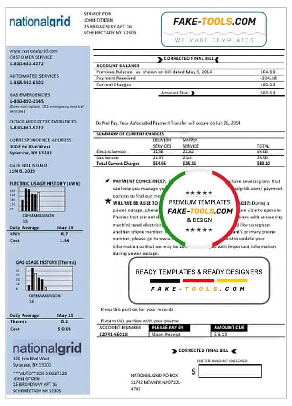 USA New York National Grid utility bill Word and Pdf Template use for :