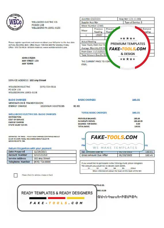 USA Pennsylvania Wellsboro Electric utility bill Word and Pdf Template use for :