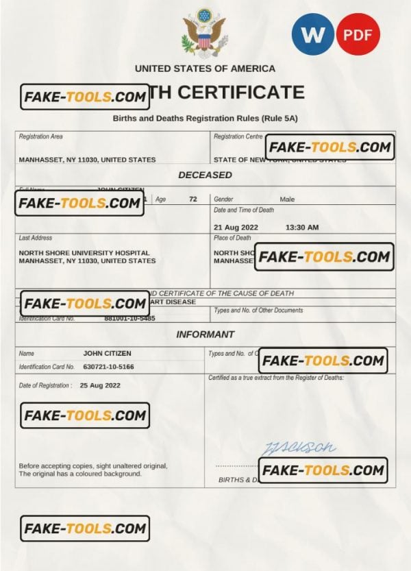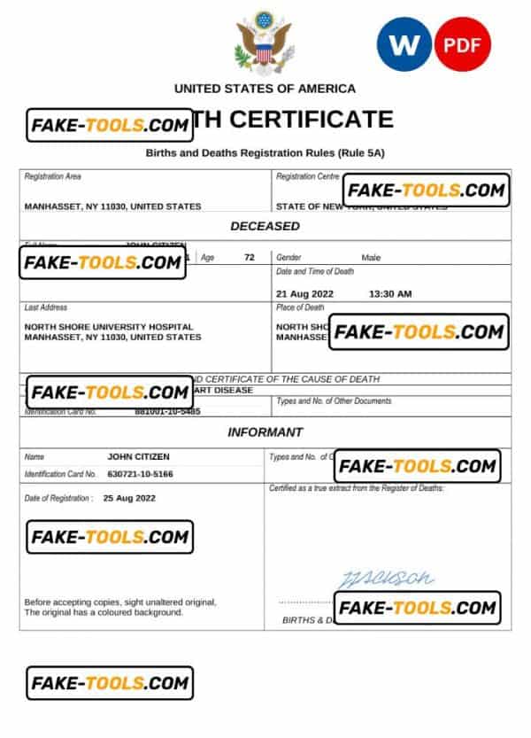 Grab now fully editable USA vital record death certificate word template from our website fake tools and put your own info to create a fake copy of Fake USA vital record death certificate word template and ready your own novelty documents. It’ll be so beneficial if your ID Card is expired, stolen or not available. We also have passport psd template, ID Card psd template, Bank Statement psd template, drivers license psd template & utility bill psd template, certificate psd template.